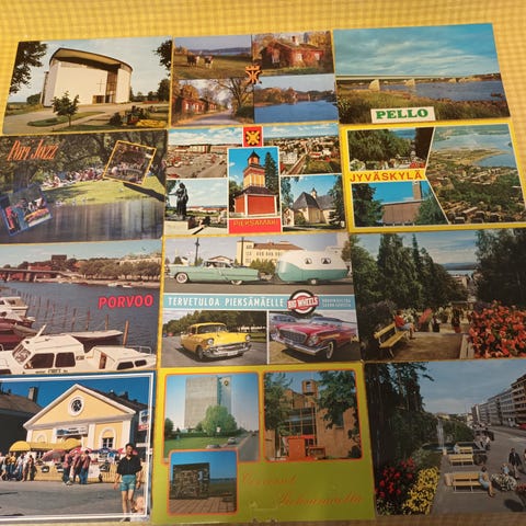 Kulkeneet paikkakuntakortit 70-luvulta 80-luvulle. Kuopio, Varkaus, Särkisalmi, Kemijärvi, Kilpisjärvi, Seinäjoen talouskoulu, Sodankylä, Siilinjärvi, Rukatunturi ja Ohtaansalmi. 0,80 e kpl