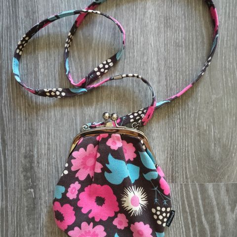 Marimekon punainen pieni olkalaukku. Leveys 18 cm ja korkeus 18 cm. Hihna 128 cm. Juuri pesty, pientä haalistumaa pesun jäljiltä.