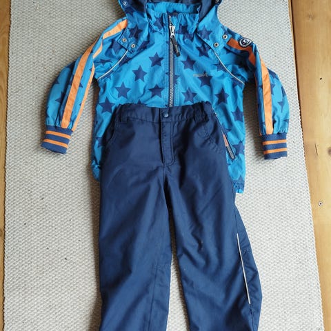 Suhteellisen hyväkuntoiset kuoritakki ja housut kokoa 98-104. Ei vuorta.