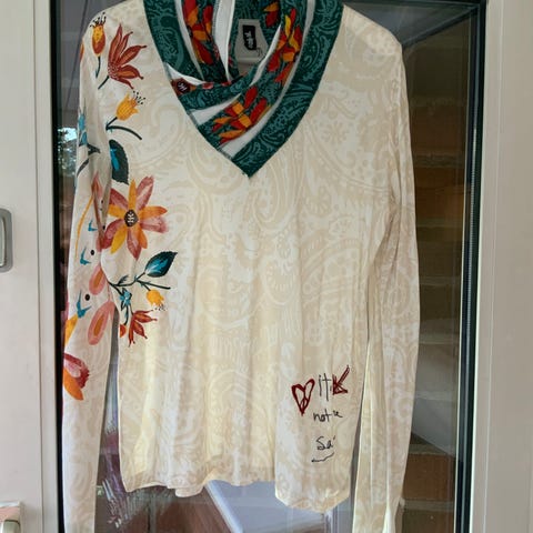 Desigual Paita sinisenä, koko L. Rypyssä säilytyksestä. 3/4 mittaiset hihat. Paidassa on kirjailtuja ja paljeteilla koristeltuja yksityiskohtia, jotka lisäävät visuaalista ilmettä.