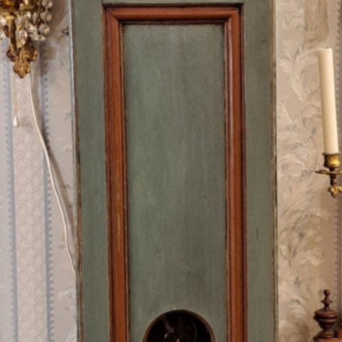 Kuvan kaappikello koneistoineen. Koneisto on ollut käyntikuntoinen, mutta iäkkään koneiston osalta ei voi antaa käynti- ja ajassapysymisen takeita.