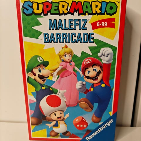 Ravensburger Malefiz Barricade on lautapeli, jossa on Mario-teemaiset hahmot. Peli sisältää pelilaudan, nopan, pelinappulat ja ohjeet. Huom yksi Puinen nappula (oranssi) puuttuu muuten kaikki osat.