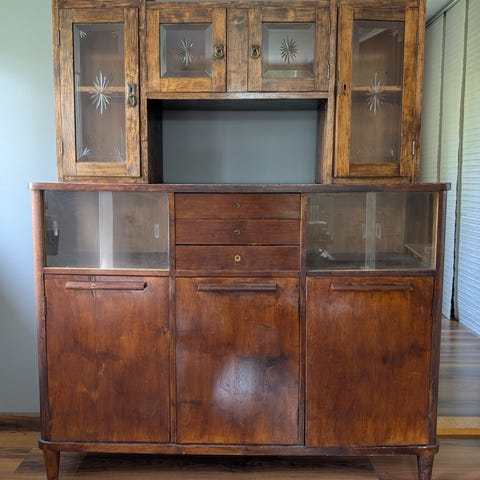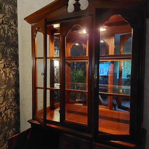 Punainen retro kaappi isolla lasilla ja lampulla.
