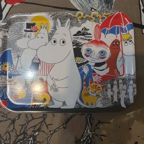 Opto Designin valmistama (takana olevan tarran mukaan Muurlan valmistuttama) Muumi tarjotin. Materiaalina koivuvaneri ja tarjottimen koko on 20 x 27cm. Oikein kaunis ja vähän harvinaisempi kuva-aihe, jossa värit ovat kirkkaat ja tarjottimen kunto muutenkin hyvä