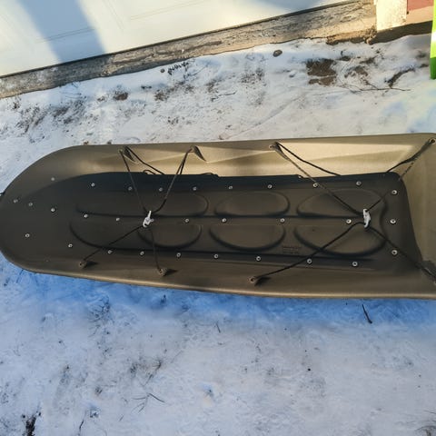 Kestävästä muovista valmistettu ahkio esimerkiksi pilkkireissuille tai halkojen hakuun liiteristä.