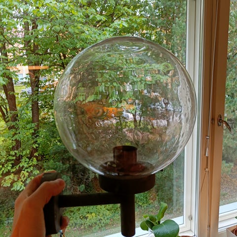 Lasinen, jäänpintaa muistuttava varjostin hajottaa valon kauniisti ja luo upean valon ja varjon leikin — valaisin on näyttävä myös sammutettuna.