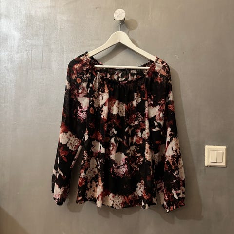 Lyhythihainen kirjava paita, arkeen tai juhlavampaankin käyttöön. Laput irroitettu ja kokeiltu päälle. Ei käytetty, eikä pesty. Väriensä puolesta sopii yhdisteltäväksi moniin yksivärisiin housuihin, hameeseen, neuletakkeihin yms.