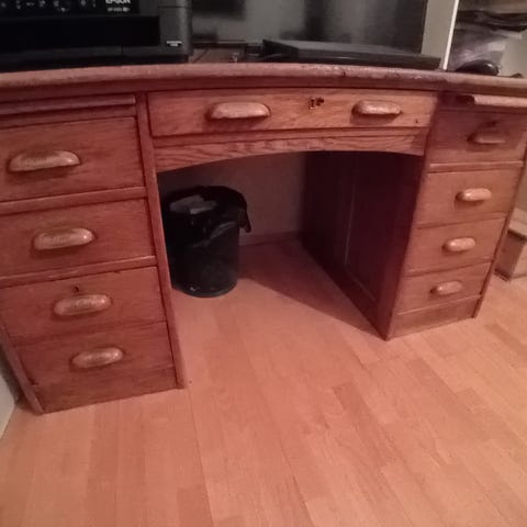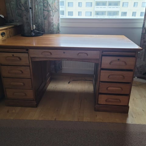 Tukeva hyvä työ- ja kirjoituspöytä. Kaikki laatikot aukeavat. Kaikissa ollut pohjalla suojana paperi. Niinkuin ennen oli hyvänä tapana. Meillä ollut sen 50v. Pöytälevy varmastikin hyvä hioa uudelleen. Mahtuu paljon tavaraa laatikoihin.