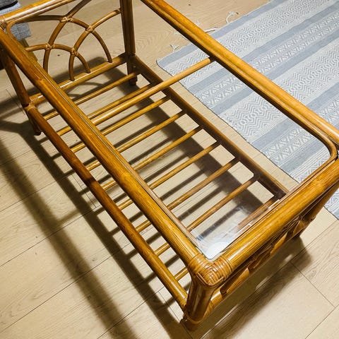 Myytävänä Parolan Rottinkin sohvapöytä. Pöytä on alkujaan ollut puunvärinen, mutta olen maalannut rungon beigeksi ja kansilevyn vahannut antiikkitammen väriseksi. Neljä tilavaa rottinkikoria. Hyvä käytetty kunto.