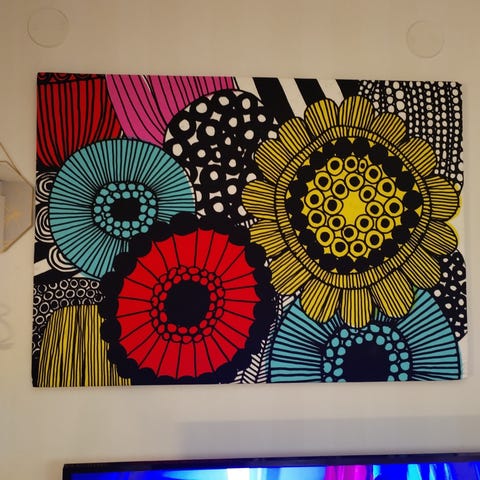 Marimekon kissanminttukankaasta tehty sisustustaulu. Korkeus 66cm leveys 121cm. Vain nouto Mouhijärveltä.