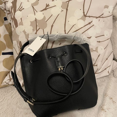 Uusi Furla Atena Keria bucket bag, väri musta. Kuvassa näkyvä kirsikkariipus 🍒 sisältyy mukaan, se on myös käyttämätön. Voin jättää sen pois, jos et halua sitä.