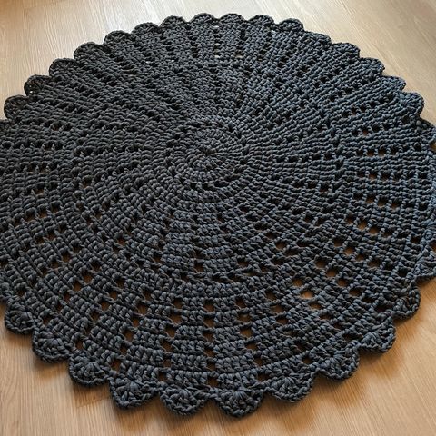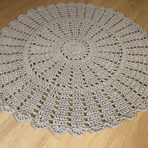 Uusi puhtaanvalkoinen Lankavan Lilli puuvillaontelokuteesta virkattu jämäkkä matto. Halkaisija 110cm. Asettuu kauniisti lattialle, eikä aaltoile.