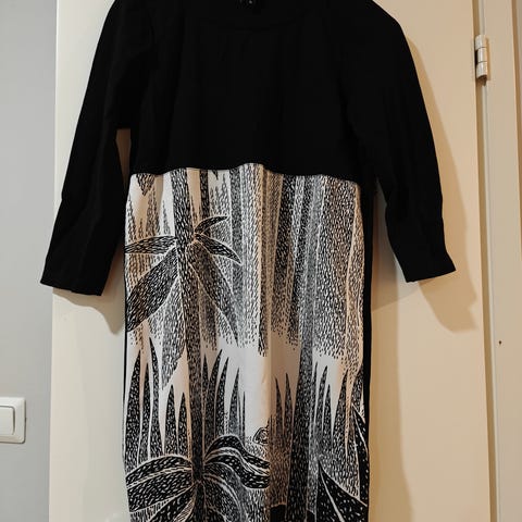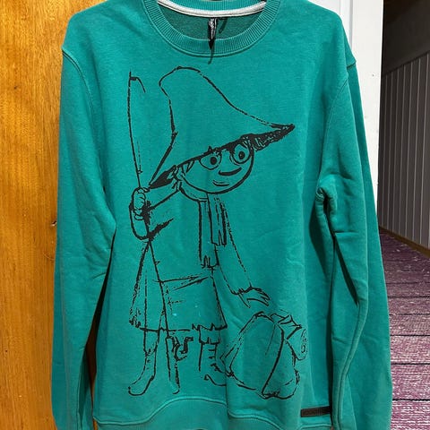 Myydään Nuuskamuikkunen, joustocollegemekko. Mekossa edessä hupparitasku, helmassa, hihansuissa ja pääntiellä resorit. Kainalo-kainalo 64 cm ja olka-helma 106 cm.