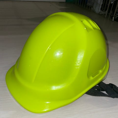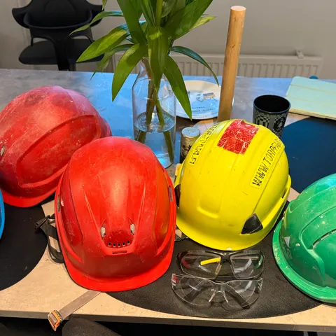 Rakennustyömailla käytettäviä suojakypäriä.