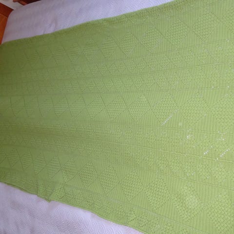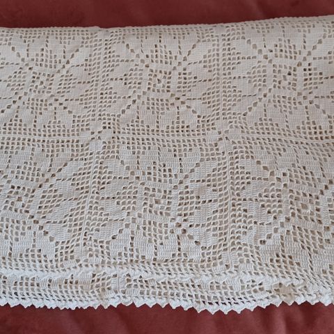 Mielestäni käyttämätön pitsinen virkattu päiväpeitto kalastajalankaa. Pituus noin 205 cm ja leveys 110-120 cm. Aivan kuin olisi osa ruuduista tehty toisen värisestä langasta, toisen päädyn selvästi keltaisemmat, toisessa päädyssä minusta muutamia lievemmin eri sävyisiä. Olisikohan haluttu jatkaa isompaan sänkyyn passeliksi. Ommeltu kasaan, mutta joitakin lankoja päättelemättä. Seikat huomioitu hinnassa.