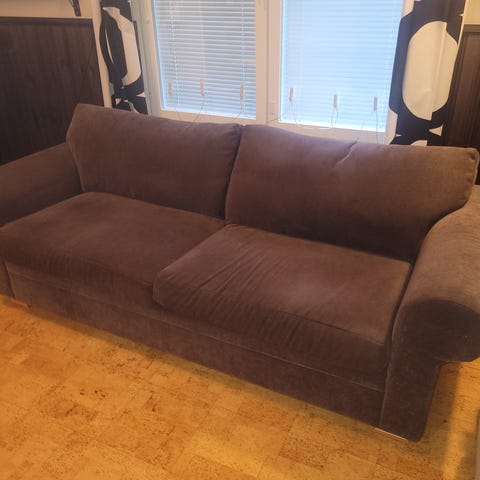 Tumman harmaa u- mallinen isohko sohva. Kankaat ehjät, pesty viimeksi toukokuussa, siisti. Yksi jalka irtoaa paikaltaan siirrettäessä on kuitenkin aina takaisin laitettavissa. Lyhyt divaani 150cm ja pitkädivaani 205cm.