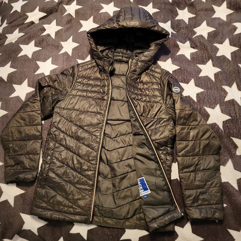 Hihoissa kyynärpäitten kohdalla jo kulumaa. Muutaman viillotkin rwi-iksi asti. Paikattavissa ja käytettävissä oleva edelleen. Meille jäi vain nyt liian pieneksi. :(