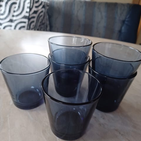 Lasien korkeus 6 cm, kuluneessa alkuperäisessä Karhula-Iittala kotelossa.