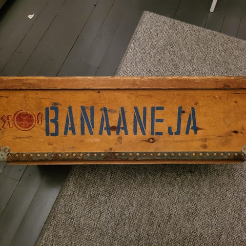 Säilytyslaatikko vaneria, metallivahvistukset. Osa sivuista maalattu harmaaksi, osa sinisiä. Leveys 116,5 cm korkeus 28,5 cm ja syvyys 78,5 cm. Ollut teatterikäytössä.