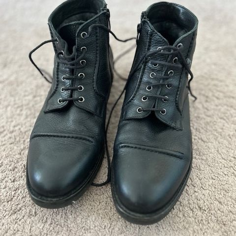 Syvän tummansiniset nahkakengät, koko 44, käytetty hyvä kunto, jotain käytön jälkiä on (näkyvimmät käytön jäljet kenkien kärjissä, ks. lisäkuvat), mutta yleisilme siisti