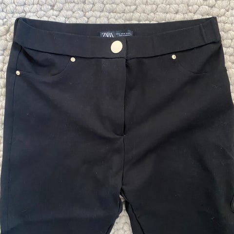 Naisten housut ZARA Mittoja vyötärö 88 cm, lahkeen pituus 94 cm, haara 37 cm ja lahkeen leveys 19 cm. Taskut edessä ja takana valetaskut. Käyttämättömät.