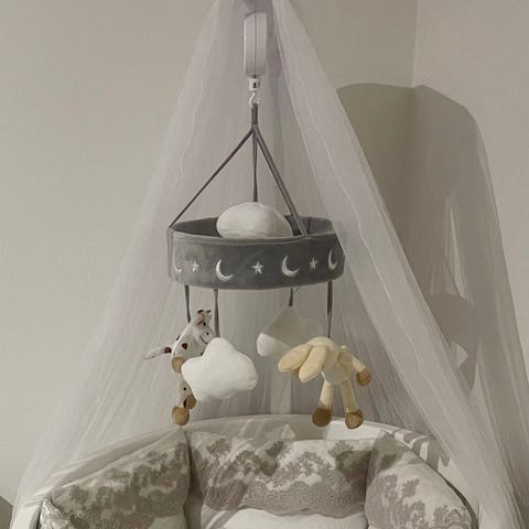 Mobileessa on pehmeitä, suloisia hahmoja ja rauhoittava ulkonäkö – täydellinen apu pienen nukuttamiseen tai vauvan huoneen koristeluun.