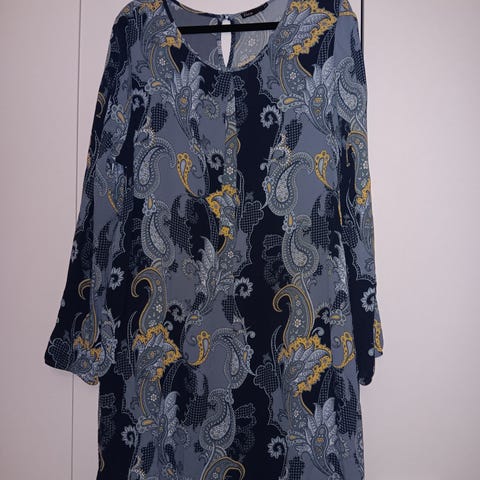 Kaunis ruskean ja turkoosin kirjava paita. V-kaulus, vajaamittaiseet hihat. Etupuolella yksivärinen ruskea valealuspaita. Kankaassa on hiukan kimallusta. Kai-kai 53 cm. Koko on ihan reilu 42, ehkä jopa 44.