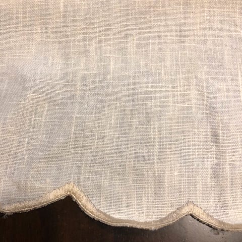 Koko 96cm X 190cm. Ruostetahra n. 15 cm pituinen, kohdassa, jossa toisesta päädystä 97cm ja toisesta päädystä 90cm ja sivusuunnasta toisesta 50cm ja toisesta 31cm. Sopii pöytäliinaksi isoon pöytään tai siitä voi ommella esim. monta laudeliinaa. Nouto tai esim. Tripla, maksu käteinen.