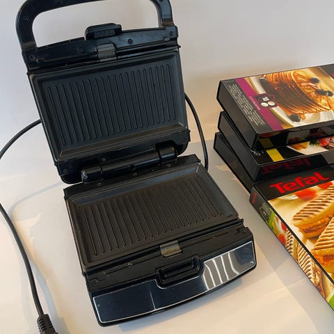 Muutaman vuoden vanha siisti ja toimiva tefalin 700w voileipägrilli ollut jo kaapin perällä parivuotta käyttämättömänä alun käytön jälkeen. Alalevyssä näkyy pientä jälkeä.