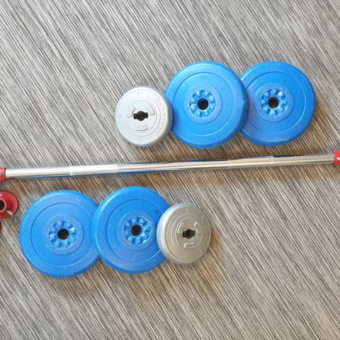 Laakeroitu painonnostotanko + levypainot, yhteensä noin 80 kg. Tangon pituus noin 150 cm, laakeroitujen päiden halkaisija n. 45 mm.