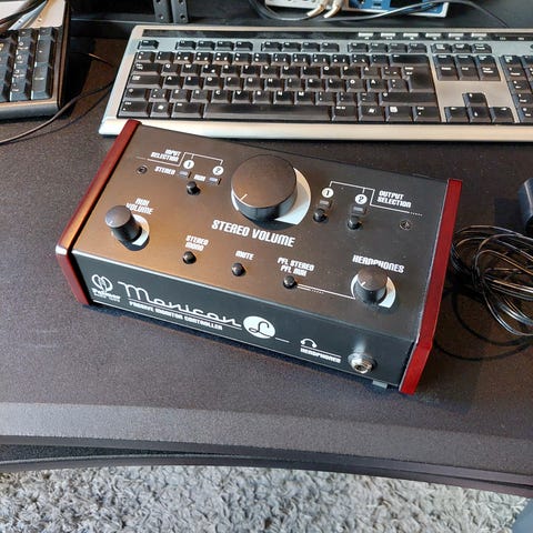 Passiivinen monitorikontrolleri. Kuulokevahvistin vaatii sähköt, muuntaja mukana.