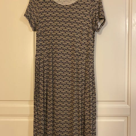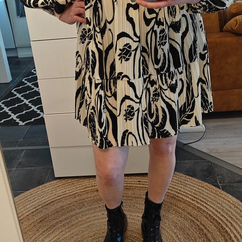 Hyvin laskeutuva mukava mekko viskoosia ja elastaania. Mekossa musta, ruskea ja luonnonvärinen kuvio.