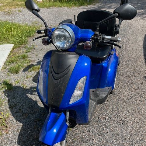 Skand sähköinen senioriskootteri sininen väri, nelipyöräinen malli, varustettu mustalla istuimella ja käsinojilla. Sopii henkilöille, jotka tarvitsevat apua liikkumisessa. Skootterissa on peilit ja etuvalot turvalliseen ajoon.