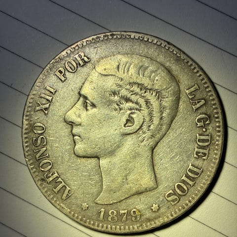 Espanjan sisällissodan aikainen kolikko, vuoden 1870 hopeinen viiden pesetan kolikko Madridista, paino 24,85 g ja halkaisija 37,56 mm. Tarjolla ilman sertifiointia Espanjan rahahistoriasta kiinnostuneille keräilijöille.