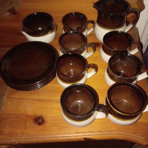 1 iso tarjoiluvati 30 cm ,kaksi ruokalautasta 25 cm , 6 salaattilautasta 21 cm , 8 leipälautasta 17 cm , 3 soikeaa kulhoa 20x14 , iso ja pieni sokeri-kermakko kannellisina , vain 1 kahvikuppi ja 1 teekuppi mutta kahvilautasia 6 , teekupin lautasia 10 .