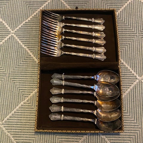 Hopeiset kahvilusikat, ruokalusikat, ottimet.