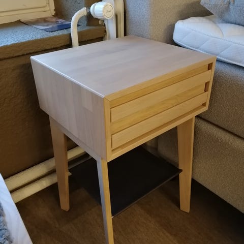 Materiaali luonnonväristä tammea, taittuva runko metallia.