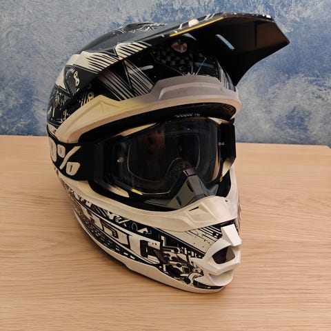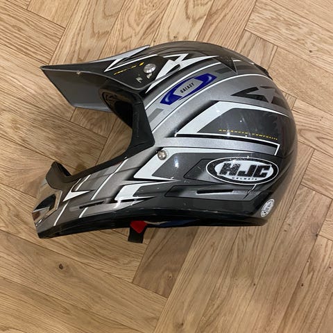 Hjc motocross kypärä, ajolasit ja hanskat.