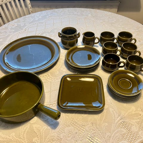 Kuvien mukaan hillo-, hunaja- astiasto: hillokulho, jossa kansi ja iso lusikka, hillolautaset ja lusikat, 6 kpl. Valmistaja Gorodnitsa Porcelain, leima v. 1970 - 1980. Mitat: kulho korkeus n.15 cm, ylähalkaisija n.12,5 cm; lusikat noin 11 cm ja 15 cm; lautaset ylähalkaisija n.12,5 cm ja korkeus n. 3,5 cm. Ehjät ja siistit Nouto, postitus (pakkaan hyvin) tai kulkeutuu omien menojen mukaan PK-seudulle.