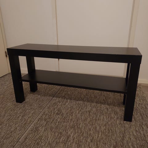 Tuunattu IKEA Lack pöytä jossa jalat ovat tehty pienemmistä Lack pöydistä ja päällystetty harmaalla DC-FIXillä. Kulkeutuu Turun suuntaan tarvittaessa.