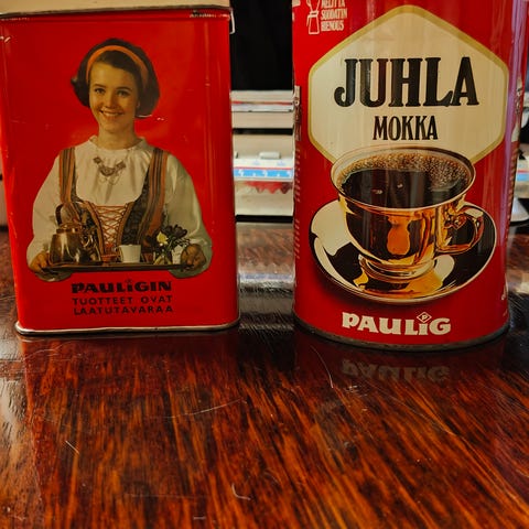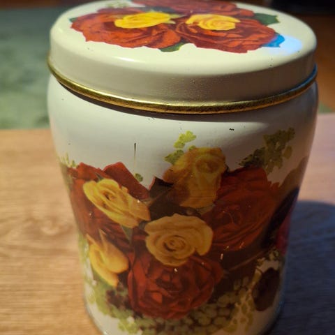 Vanha kahvipurkki, ehjä ja hyväkuntoinen.
