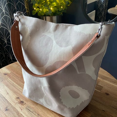 Marimekko Kuunsäde Unikko olkalaukku, väri on beige. Laukku on yleisesti hyvässä kunnossa, ei isoja tahroja tai vaurioita. Jonkin verran käytön jälkiä kuitenkin löytyy, esimerkiksi viimeisessä kuvassa näkyvät tahrat.