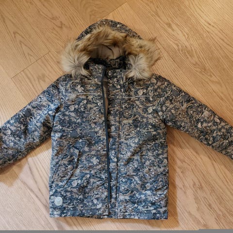 Wheat lasten harmaa talvitakki. Pörröinen huppu ja viisi taskua. Koko on 152. Tarkoitettu noin 12-vuotiaille.