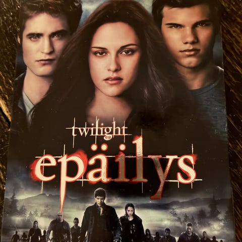 2 dvd:tä! Twilight Epäilys on DVD-elokuva, joka kuuluu Twilight-sarjaan. Leffa 1h 59 min ja lisämateriaali 3h 9 min.