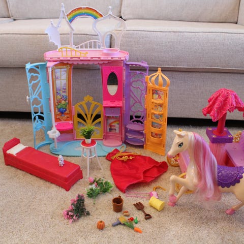 Vähäisillä leikeillä ollut Barbie 12 tanssivaa prinsessaa huonekalut ja siihen kuuluvat asusteet. Kuvista näkee hyvin, mitä setti sisältää.