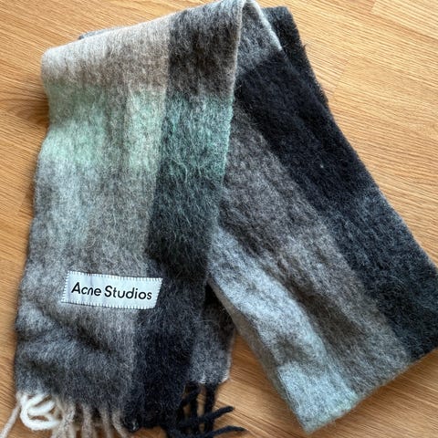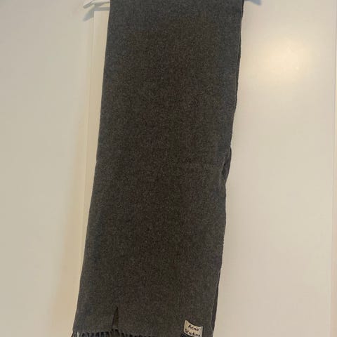 Acne Studios kaksipuolinen harmaa villainen logo kaulahuivi, koko One Size. Mitat 50x220cm.