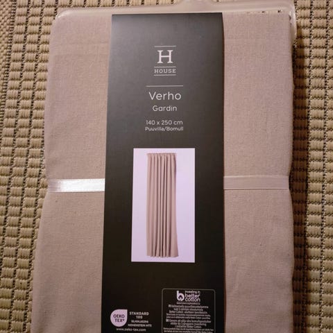 Eurokankaalla tehdyt ruskeat pellavaverhot. Sisältää painot helmaan. Pesetetty pesulassa, ei käytetty pesun jälkeen.