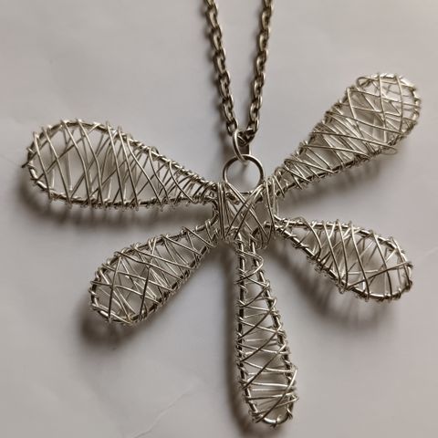 Pitkä kaulakoru, jossa sudenkorento-riipus. Ketjun pituus 80 cm.