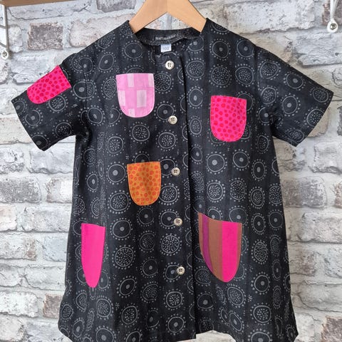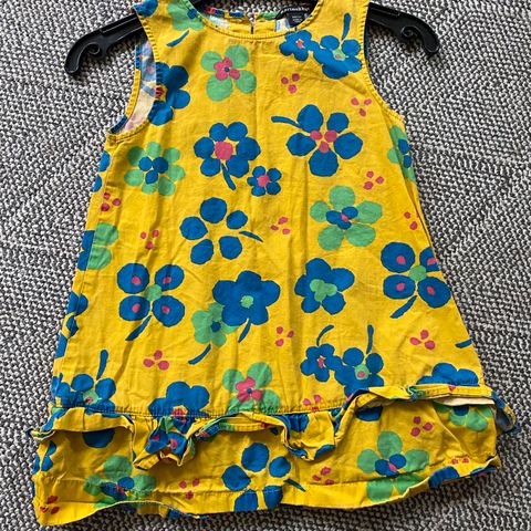 Katsuiji Wakisaka suunnittelemasta Marimekon Nekku-kankaasta itsetehty mekko koko noin 98 cm. Materiaali puuvillaa.