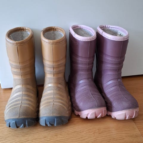 Pinkit Vikingin lämpökumpparit, ehjät, myöskään vuori ei ole kantapään takaa rikki. Tummentumaa, kuvassa juuri huuhdeltu.